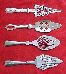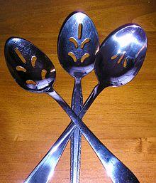 A slotted spoon is a spoon implement used in food preparation. The term can be used to describe any spoon with slots, holes or other openings in the bowl of the spoon which let liquid pass through while preserving the larger solids on top. It is similar in function to a sieve; however, a ladle-sized slotted spoon is most typically used to retrieve items from a cooking liquid while preserving the liquid in the pot, while table-sized slotted spoons are often used to serve foods prepared or packaged in juices, such as canned fruit and vegetables.