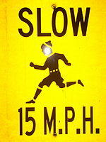 Slow children at play is a common sign seen in American cities urging motorists to slow down.[1] The signs are seen around areas where children frequent, such as playgrounds and schools. They are almost always characterized by the words "Slow Children At Play" and a picture of a child running. They sometimes have a "suggested limit" posted on them. This rate is not a regulated or legal limit but rather a suggested rate that you may want to use if children are present. A regulated speed sign is always white with black lettering and the words "Speed Limit" are on the sign. This sign is yellow and is considered an "Advisory" or caution sign.
