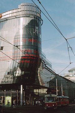 Between 1945 and 1989, the district contained a monument dedicated to Soviet tanks in World War II, which was located in Štefánik square.[1] The monument was removed shortly after the Velvet Revolution and a new glass-and-steel building designed by French architect Jean Nouvel became a symbol of the district. An angel (anděl in Czech) from Wim Wenders' movie Wings of Desire is etched into the glass on the façade. The local traffic hub was renamed to Anděl from Moskevská (after Moscow). The Staropramen brewery is located in Smichov.