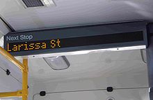 - Electronic "next stop" signage on each bus which displays and announces the next stop. These announcements cut-in commercial radio broadcasts.