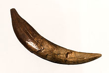 In his 1880 article about extinct cats, Cope also named a third species of Smilodon, S. gracilis. The species was based on a partial canine, which had been obtained in a cave near the Schuylkill River in Pennsylvania. Cope found the canine to be distinct from that of the other Smilodon species due to its smaller size and more compressed base.[7] Its specific name refers to the species' lighter build.[10] This species is known from fewer and less complete remains than the other members of the genus.[11] S. gracilis has at times been considered part of genera such as Megantereon and Ischyrosmilus.[12] S. populator, S. fatalis and S. gracilis are currently considered the only valid species of Smilodon, and features used to define most of their junior synonyms have been dismissed as variation between individuals of the same species (intraspecific variation).[4][3] One of the most famous of prehistoric mammals, Smilodon has often been featured in popular media and is the state fossil of California.[1]