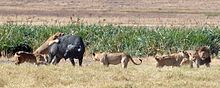 Another argument for sociality is based on the healed injuries in several Smilodon fossils, which would suggest that the animals needed others to provide them food.[72][73] This argument has been questioned, as cats can recover quickly from even severe bone damage and an injured Smilodon could survive if it had access to water.[74] The brain of Smilodon was relatively small compared to other cat species. Some researchers have argued that Smilodon's brain would have been too small for it to have been a social animal.[75] An analysis of brain size in living big cats found no correlation between brain size and sociality.[76] Another argument against Smilodon being social is that being an ambush hunter in closed habitat would likely have made group-living unnecessary, as in most modern cats.[74] Yet it has also been proposed that being the largest predator in an environment comparable to the savanna of Africa, Smilodon may have had a social structure similar to modern lions, which possibly live in groups primarily to defend optimal territory from other lions (lions are the only social big cats today).[49]