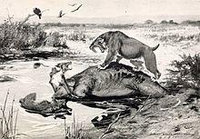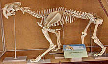 As Smilodon migrated to South America, its diet changed; bison were absent, the horses and proboscideans were different, and native ungulates such as toxodonts and litopterns were completely unfamiliar, yet S. populator thrived as well there as its relatives in North America.[14] Isotopic analysis for Smilodon populator suggests that its main prey species included Toxodon platensis, Pachyarmatherium, Holmesina, species of the genus Panochthus, Palaeolama, Catonyx, Equus neogeus, and the crocodilian Caiman latirostris. This analysis of its diet also indicates that S. populator hunted both in open and forested habitats.[46] The differences between the North and South American species may be due to the difference in prey between the two continents.[8] Smilodon probably avoided eating bone and would have left enough food for scavengers.[47] Smilodon itself may have scavenged dire wolf kills.[48] It has been suggested that Smilodon was a pure scavenger that used its canines for display to assert dominance over carcasses, but this theory is not supported today as no modern terrestrial mammals are pure scavengers.[49]