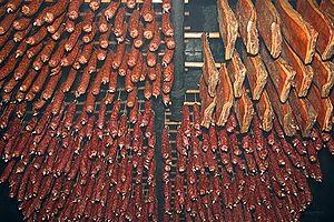 The smoking of food likely dates back to the paleolithic era.[7][8] As simple dwellings lacked chimneys, these structures would probably have become very smoky. It is supposed that early humans would hang meat up to dry and out of the way of pests, thus accidentally becoming aware that meat that was stored in smoky areas acquired a different flavor, and was better preserved than meat that simply dried out. This process was later combined with pre-curing the food in salt or salty brine, resulting in a remarkably effective preservation process that was adapted and developed by numerous cultures around the world.[9] Until the modern era, smoking was of a more "heavy duty" nature as the main goal was to preserve the food. Large quantities of salt were used in the curing process and smoking times were quite long, sometimes involving days of exposure.[7]