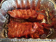 Smoke-roasting refers to any process that has the attributes of both roasting and smoking. This smoking method is sometimes referred to as barbecuing or pit-roasting. It may be done in a smoke-roaster, a closed wood-fired oven, or a barbecue pit, any smoker that can reach above 121 °C (250 °F), or in a conventional oven by placing a pan filled with hardwood chips on the floor of the oven so that the chips can smolder and produce a smoke-bath.[14] In North America, this smoking method is commonly referred to as "barbecuing", "pit baking", or "pit roasting".