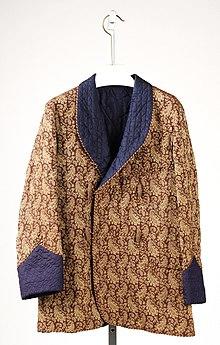 Originating in the 1850s, The Gentleman's Magazine of London, England, defined the smoking jacket as a "kind of short robe de chambre [i.e. a banyan], of velvet, cashmere, plush, merino or printed flannel, lined with bright colours, ornamented with brandebourgs [i.e. frogs], olives or large buttons."[1]