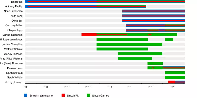 "Smosh Games" uploads numerous videos a week, consisting of Let's Plays and video game commentary shows. When the channel was first created, Padilla and Hecox were regular features of these videos; however, over time they began to appear less regularly on this channel, with fellow Smosh Games members Mari Takahashi, Joshua "Joven" Ovenshire, David "Lasercorn" Moss, Matthew Sohinki, Amra "Flitz" Ricketts,[57] Wesley "Wes The Editor" Johnson,[58] Ericka "Boze" Bozeman and Damien Haas handling most hosting duties. The channel has over 7.3 million subscribers, and over 2.8 billion video views as of November 2018.[59] Takahashi,[60] Moss,[61] Sohinki,[62] Ovenshire,[63] Ricketts,[64] and Johnson[65] also have their own channels, which are not considered part of the Smosh roster. Since summer 2015, the channel has hosted annual "Smosh Summer Games" and "Smosh Winter Games" events, primarily hosted on the Smosh Games channel with other videos posted to Smosh 2nd Channel as well. The first Summer Games in 2015 introduced Shayne Topp to the Smosh family as a referee, while the 2017 Winter Games introduced Boze to the lineup. Damien Haas joined later in 2017. In August that year, Sohinki and Lasercorn announced that they would no longer be full-time members of Smosh Games, in order to focus on their new channel Toaster Ghost, and for Lasercorn to spend more time with his son. They have not ruled out appearing in future Smosh-related videos however, and have appeared occasionally in videos since then.