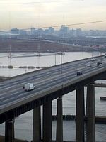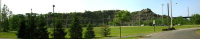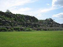 Snake Hill (known officially as Laurel Hill) is an igneous rock intrusion jutting up from the floor of the Meadowlands in southern Secaucus, New Jersey, at a bend in the Hackensack River.[1] It was largely obliterated in the 1960s by quarrying that reduced the height of some sections by one-quarter and the area of its base by four fifths.[2] The diabase rock was used as building material in growing areas like Jersey City. The remnant of the hill is the defining feature of Laurel Hill County Park. The high point, a 203-foot (62 m) graffiti-covered inselberg rock formation, is a familiar landmark to travelers on the New Jersey Turnpike's Eastern Spur, which skirts the hill's southern edge. The crest of the hill's unusual, sloping ridge is about 150 feet (46 m) high.