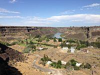 Snake River Canyon is a canyon formed by the Snake River in the Magic Valley region of southern Idaho, forming part of the boundary between Twin Falls County to the south and Jerome County to the north. The canyon ranges up to 500 feet (150 meters) deep and 0.25 miles (0.4 kilometers) wide, and runs for just over 50 miles.[1] Perrine Bridge crosses the canyon immediately north of the city of Twin Falls. Shoshone Falls is located approximately 5 miles (8 kilometers) east of Perrine Bridge along the canyon. The canyon continues through Glenns Ferry and south of Boise, making it longer than 50 miles