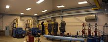 The next step in the snowmaking process is to add air using an air plant. This plant is often a building which contains electric or diesel industrial air compressors the size of a van or truck. However, in some instances air compression is provided using diesel-powered, portable trailer-mounted compressors which can be added to the system. Many fan-type snow guns have on-board electric air compressors, which allows for cheaper, and more compact operation. A ski area may have the required high-output water pumps, but not an air pump. Onboard compressors are cheaper and easier than having a dedicated pumping house. The air is generally cooled and excess moisture is removed before it is sent out of the plant. Some systems even cool the water before it enters the system. This improves the snowmaking process as the less heat in the air and water, the less heat must be dissipated to the atmosphere to freeze the water. From this plant the air travels up a separate pipeline following the same path as the water pipeline.