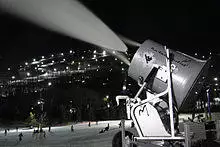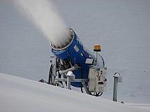 Snowmaking is the production of snow by forcing water and pressurized air through a "snow gun," also known as a "snow cannon." Snowmaking is mainly used at ski resorts to supplement natural snow. This allows ski resorts to improve the reliability of their snow cover and to extend their ski seasons from late autumn to early spring. Indoor ski slopes use snowmaking. They can generally do so year-round as they have climate-controlled environments.