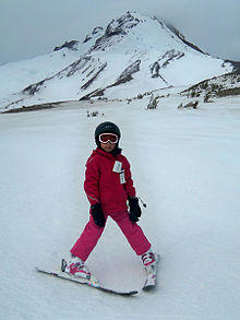 The snowplough turn, also known as a wedge turn or the pizza slice, is a downhill skiing braking and turning technique taught to beginners. The front ski tips of the skis are together and the tails wide apart, with the knees rolled inwards slightly. By applying pressure against the snow with the inside edges of the skis speed is reduced, making turning in such a configuration and stopping completely possible. To turn, weight is shifted from the downhill, outside-of-the-turn ski to the uphill, inside-of-the-turn ski. As the turn is completed, the old uphill, inside ski then becomes the new downhill, outside ski.