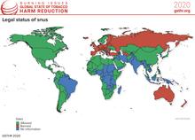 Sale of snus is illegal in all the European Union countries except for Sweden, Estonia, Czech Republic and Denmark.[2][3] It is also the most common form of tobacco in Norway and available in Switzerland as well. Canada makes it difficult to obtain snus through discouraging its users by implementing high taxes on products like snus. Some EU countries like Estonia[4] allow the sale of snus-like products that contain nicotine but no tobacco. Local varieties of snus, growing in popularity in the United States, have been seen as an alternative to smoking, vaping, e-smoking, chewing, dipping, dissolvable and snuff tobacco. However, US-manufactured snus does not have the same production standards or ingredients as Swedish snus, and typically uses significant amounts of sweeteners.[5]
