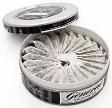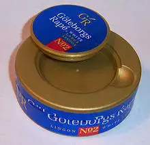 Swedish snus is made from air-dried tobacco from various parts of the world. In earlier times, tobacco for making snus was laid out for drying in Scania and Mälardalen, Sweden. Later, Kentucky tobaccos were used. The ground tobacco is mixed with water, salt, an alkalizing agent (today this is sodium carbonate), and aroma, and is prepared through heating. After the heating process, food grade aromas are typically added. In Sweden, snus is regulated as a food product and, for this reason, all ingredients are listed on the label of each individual package (can) of snus. Moist snus contains more than 50% water, and the average use of snus in Sweden is approximately 800 grams (16 units) per person each year. About 12% (1.1 million people) of the population in Sweden use snus.[16] Unlike dipping tobacco and chew, most snus today does not undergo the fermentation process, but is instead steam-pasteurized. Although steam-pasteurization is remarkably complex, it has the advantages of inhibiting the growth of bacteria that facilitate the formation of tobacco-specific nitrosamines, while preserving the desired texture and mouthfeel of the snus. The absorption of nicotine, the addictive substance in tobacco, from snus depends on the level of nicotine in the snus and the pH level in the box.[17] A voluntary quality standard for snus products has been introduced (Gothiatek) that sets maximum levels for certain controversial constituents including nitrosamines, heavy metals, and polyaromatic hydrocarbons. Most manufacturers of Scandinavian type snus adhere to this standard.