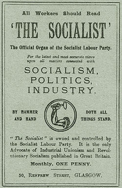 Although deeply influenced by the Socialist Labor Party of America, members of the fledgling British organisation sought their intellectual independence from the start.[6] Whereas the American SLP strongly opposed advancing ameliorative "immediate demands," the new British organisation did not follow, instead initially choosing to adopt a programme of immediate demands matching those of the SDF from whence it sprung.[7] Indeed, there was some discussion as to whether the new party should adopt an altogether different name so as to further delineate themselves from their American counterparts. Trade unionist Tom Bell, a delegate to the inaugural conference, later recalled: