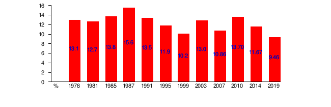 1989 | 96,189 | 22.0 (#1) | 18 / 75 | in coalition | |||