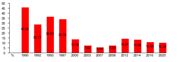 | 1992–93 | 1,478,918 | 33.3% | 47 / 138 | government | ||