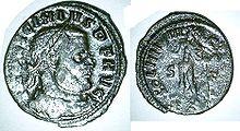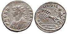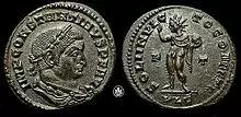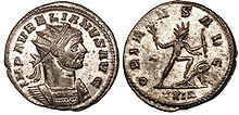 ![]() Identical reverse as the coin of Constantine I but with Emperor Licinius on head | ![]() Aurelian in his radiate crown, on a silvered bronze coin struck at Rome, 274–275 |