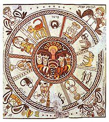 A mosaic floor in Hamat Tiberias presents David as Helios surrounded by a ring with the signs of the zodiac.[55] As well as in Hamat Tiberias, figures of Helios or Sol Invictus also appear in several of the very few surviving schemes of decoration surviving from Late Antique synagogues, including Beth Alpha, Husefa, all now in Israel, and Naaran in the West Bank. He is shown in floor mosaics, with the usual radiate halo, and sometimes in a quadriga, in the central roundel of a circular representation of the zodiac or the seasons. These combinations "may have represented to an agricultural Jewish community the perpetuation of the annual cycle of the universe or ... the central part of a calendar".[56]