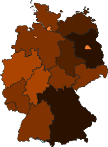 Germany is made up of sixteen, partly sovereign federal states or Länder. The southern states of Bavaria and Baden-Württemberg account for about half of the total, nationwide PV deployment and are also the wealthiest and most populous states after North Rhine-Westphalia. However, photovoltaic installations are widespread throughout the sixteen states and are not limited to the southern region of the country as demonstrated by a watts per capita distribution.