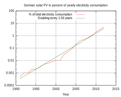 The history of Germany's installed photovoltaic capacity, its average power output, produced electricity, and its share in the overall consumed electricity, showed a steady, exponential growth for more than two decades up to about 2012. Solar PV capacity doubled on average every 18 months in this period; an annual growth rate of more than 50 percent. Since about 2012 growth has slowed down significantly.