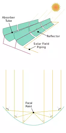 A parabolic trough consists of a linear parabolic reflector that concentrates light onto a receiver positioned along the reflector's focal line. The receiver is a tube positioned along the focal points of the linear parabolic mirror and is filled with a working fluid. The reflector is made to follow the sun during daylight hours by tracking along a single axis. Parabolic trough systems provide the best land-use factor of any solar technology.[19] The Solar Energy Generating Systems plants in California and Acciona's Nevada Solar One near Boulder City, Nevada are representatives of this technology.[20][21]