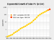 The early development of solar technologies starting in the 1860s was driven by an expectation that coal would soon become scarce. Charles Fritts installed the world's first rooftop photovoltaic solar array, using 1%-efficient selenium cells, on a New York City roof in 1884.[35] However, development of solar technologies stagnated in the early 20th century in the face of the increasing availability, economy, and utility of coal and petroleum.[36] In 1974 it was estimated that only six private homes in all of North America were entirely heated or cooled by functional solar power systems.[37] The 1973 oil embargo and 1979 energy crisis caused a reorganization of energy policies around the world and brought renewed attention to developing solar technologies.[38][39] Deployment strategies focused on incentive programs such as the Federal Photovoltaic Utilization Program in the US and the Sunshine Program in Japan. Other efforts included the formation of research facilities in the United States (SERI, now NREL), Japan (NEDO), and Germany (Fraunhofer ISE).[40] Between 1970 and 1983 installations of photovoltaic systems grew rapidly, but falling oil prices in the early 1980s moderated the growth of photovoltaics from 1984 to 1996.