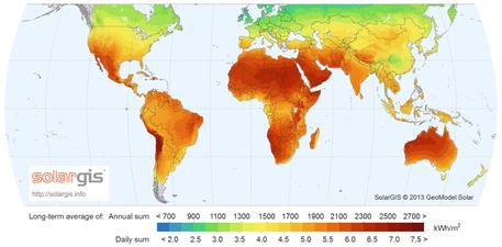 This solar resource map provides a summary of the estimated solar energy available for power generation and other energy applications. It represents the average daily/yearly sum of electricity production from a 1 kW-peak grid-connected solar PV power plant covering the period from 1994/1999/2007 (depending on the geographical region) to 2015. Source: Global Solar Atlas
