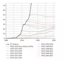 In 2010, the International Energy Agency predicted that global solar PV capacity could reach 3,000 GW or 11% of projected global electricity generation by 2050—enough to generate 4,500 TWh of electricity.[48] Four years later, in 2014, the agency projected that, under its "high renewables" scenario, solar power could supply 27% of global electricity generation by 2050 (16% from PV and 11% from CSP).[3]