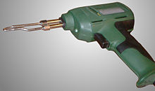 A soldering gun is an approximately pistol-shaped, electrically powered tool for soldering metals using tin-based solder to achieve a strong mechanical bond with good electrical contact. The tool has a trigger-style switch so it can be easily operated with one hand. The body of the tool contains a transformer with a primary winding connected to mains electricity when the trigger is pressed, and a single-turn secondary winding of thick copper with very low resistance. A soldering tip, made of a loop of thinner copper wire, is secured to the end of the transformer secondary by screws, completing the secondary circuit. When the primary of the transformer is energized, several hundred amperes of current flow through the secondary and very rapidly heat the copper tip. Since the tip has a much higher resistance than the rest of the tubular copper winding, the tip gets very hot while the remainder of the secondary warms at a much slower rate. An additional secondary winding is often used to power a pilot lamp which illuminates the workpiece.