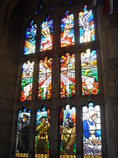 The tower features a dramatic 12-panel stained-glass window that is partly a visual interpretation of John McCrae's "In Flanders Fields", along with 8 smaller stained-glass windows that depict men and women of the armed forces at wartime. This memorial is dedicated to members of the University of Toronto who served in the First and Second World Wars.[3] A museum within the tower showcases a collection of medals, memorial books, portraits, photographs, flags and miscellaneous memorabilia from the period. A memorial stained glass window is dedicated to three University College students (Malcolm Mackenzie, I.H. Mewburn, and William Tempest) killed in the Fenian Raids.[4] High on the wall of the Memorial Room there is a memorial carved in stone for each of the Carillon of 51 bells (iron plus playing console) which memorialize individuals at the University of Toronto who lost their lives in World War I.[5]