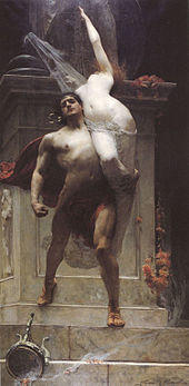 Solomon's painting was grounded in his influence from his teacher Alexandre Cabanel, but was also influenced by Frederic Leighton and Lawrence Alma-Tadema. Solomon painted mainly portraits to earn a living, but also painted dramatic, theatrical scenes from mythology and the bible on large canvasses. These scenes include some of his more popular paintings. In 1897 he painted a mural for the Royal Exchange, London Charles I demanding the Five Members at the Guildhall, 1641–42. One of Solomon's most popular works was Samson (1887), depicting a scene from the biblical story of Samson and Delilah.[1] This painting was praised for its use of multiple male nudes in active poses.[4] Samson is one of few Solomon paintings on regular display, at the Walker Art Gallery in Liverpool.[1] Some other Solomon paintings that have received significant attention include Ajax and Cassandra (1886, illustration, right) and The Birth of Love (1896).[1]