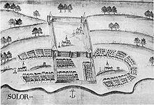 In 1520, the Portuguese established a trading post in the village of Lamakera on the eastern side of the island as a transit harbor between Maluku and Portuguese Malacca. In 1562, Dominican priests built a palm-trunk fortress which Javanese Muslims burned down the following year. The fort was rebuilt from more durable materials and the Dominicans commenced the Christianisation of the local population.[3] By 1590 the Portuguese and Christian population numbered about 25,000. There were, however, repeated displays of resistance against both the Portuguese and their religion; in 1598–1599, for example, the Portuguese required an armada of 90 ships to put down a Solorese uprising.[4]