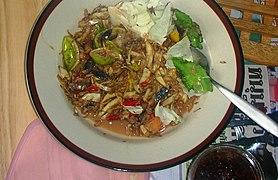 A non-spicy green papaya salad version also exists in Laos, Vietnam and Thailand, which is much sweeter; it often contains crushed peanuts and is less likely to have padaek or brined crab.[29] Dried brine shrimp are used in this Central Thai version. There are also versions that make use of unripe mangoes, apples, cucumbers, carrots and other firm vegetables or unripe fruit. Besides using varieties of fruits or vegetables as the main ingredient a popular option is to use vermicelli rice noodle wherein the dish is known as tam sua.