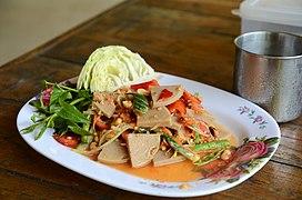 Green papaya salad is a spicy salad made from shredded unripe papaya. Originating from ethnic Lao people, it is also eaten throughout Southeast Asia. Locally known in Thailand as som tam (Thai: ส้มตำ, pronounced [sôm tām]), in Laos as tam som (Lao: ຕໍາສົ້ມ) or the more specific name tam maak hoong (Lao: ຕໍາໝາກຫຸ່ງ, pronounced [tàm.ma᷆ːk.hūŋ]), in Cambodia as bok l'hong (Khmer: បុកល្ហុង, pronounced [ɓok lhoŋ]) and in Vietnam as gỏi đu đủ.