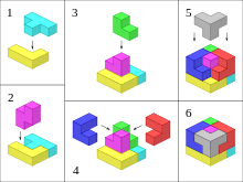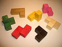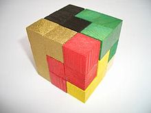 The Soma cube is a solid dissection puzzle invented by Piet Hein in 1933[1] during a lecture on quantum mechanics conducted by Werner Heisenberg. Its name is alleged to be derived from the fictitious drug soma consumed as a pastime by the establishment in Aldous Huxley's dystopic novel Brave New World.[2]