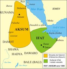 The Sultanate of Ifat, led by the Walashma dynasty with its capital at Zeila, ruled over parts of what is now eastern Ethiopia, Djibouti, northern somalia. The historian al-Umari records that Ifat was situated near the Red Sea coast, and states its size as 15 days travel by 20 days travel. Its army numbered 15,000 horsemen and 20,000 foot soldiers. Al-Umari also credits Ifat with seven "mother cities": Belqulzar, Kuljura, Shimi, Shewa, Adal, Jamme and Laboo.[85] In the Middle Ages, several powerful Somali empires dominated the regional trade including the Ajuran Sultanate, which excelled in hydraulic engineering and fortress building,[86] the Adal Sultanate, whose general Ahmad ibn Ibrahim al-Ghazi (Ahmed Gurey) was the first commander to use cannon warfare on the continent during Adal's conquest of the Ethiopian Empire,[87] and the Sultanate of the Geledi, whose military dominance forced governors of the Omani empire north of the city of Lamu to pay tribute to the Somali Sultan Ahmed Yusuf.[88] The Harla, an early group who inhabited parts of Somalia, Tchertcher and other areas in the Horn, also erected various tumuli.[89] These masons are believed to have been ancestral to the Somalis ("proto-Somali").[90]