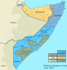 ![]() Area controlled by Somalia shown in dark green; claimed but uncontrolled Somaliland (a self-declared but unrecognized state internationally considered to be part of Somalia) shown in light green. n.b., zones of control are approximate at this time. | |||||||
