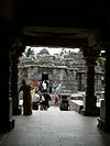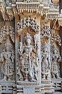 The Keshava temple at Somanathapura faces east and is enclosed in a walled courtyard with a major gate (mahadvara).[17] Outside the walls before the gate stands a tall pillar, which once had a Garuda statue on top, now missing. Inside the gate, to the left are vertical standing inscription stones. These stones have the form of the hero stones, with the top decorated with Hindu iconography as well as miniature reliefs of Keshava, Janardhana and Venugopala. The inscription is in old Kannada. The small entrance mandapa is supported by lathe-carved soapstone pillars.[3][17] The temple is carved from soapstone, a green-grey chloritic schist material that is soft in quarry but hardens when exposed to air. This is not locally available and must have been imported from another part of South India. It enabled the artists to shape and carve out intricate details for the artwork.[18][19]