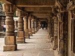 The northern and southern row of small shrines inside the pillared courtyard corridor consists of eighteen single shrine and one linked-double shrine each. The linked-double shrine is at the northwestern and southwestern corners of the courtyard. The western row consists of fourteen small shrines, while the eastern row consists of eight single small shrines and two linked-double shrines. In total, the Kesava temple consists of 58 small 1x1 small shrines, 4 small 2x1 linked-double shrines, 2 near entrance, and the main central temple.[20] The 64 corridor shrines once featured Vedic and Puranic deities and rooms for pilgrims. The statues in the smaller shrines were defaced, their limbs broken or destroyed. Some of the recovered broken pieces are in a heap inside the temple. The collection includes Jaina statues in the Kayotsarga posture as well as numerous Hindu statues. The ceiling of the southern array of shrines has carvings on its ceiling, the western does not and it have an repair related inscription instead from Vijayanagara Empire era. The northern array also mostly lacks any ceiling art work except near the stairs in the middle, while the eastern array shows the greatest signs of damage and restoration with most small shrines missing but for signs of their foundation.[21]