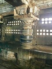 The mandapa (hall) is supported by lathe turned pillars.[36] The pillars, except two of them, are of the same size. All of them, except four in center, have five mouldings from common life themes stacked in sequence: disc, bell, pot, wheel and umbrella. The four set of central square pillars of the Navaranga have yakshas and brackets, which have been damaged or have disappeared. The two pillars to the east of the central square are shaped as a 32 pointed-star.[35][36]
