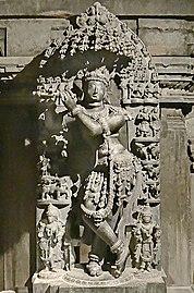 The south shrine entrance has two dvarapalas: Bhadra and Subhadra. The lintel above the entrance shows Venugopala. A 13th century Lakshminarayana carving is shown seated in the Sukhasana yoga pose, with him are chakra, conch, lotus and a gada (mace). Past the Sukhanasi, are Jaya and Vijaya, while the lintel shows a seated Vishnu and the canopy shows a dancing Vishnu.[37] The south garbha griya is 8'x8' feet square, but includes niches into the wall for more space. The image of Krishna in the sanctum is 4.5 feet high. He wears ear rings, necklaces, armlets, bracelets, finger rings, toe rings, anklets, girdle and jewelled diadem.[37] His legs are crossed, head slightly bent as he plays the bansuri (flute) he holds with both his hands. His fingers are in a tapping position, and all beings - from humans to cows, gods to goddesses inside the sanctum are depicted as absorbed in the divine music. Some figures are shown running to listen to the music, their clothes slipping off. Above the householders, gopis and cows are shown rishis (sages) who too are lost in the experience.[37]