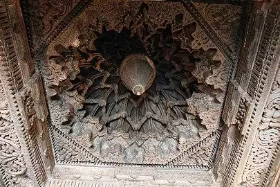 The Navaranga roof consists of 16 squares, nine in the sabha mandapa and the remaining seven in the extension near the eastern entrance. These are all carved, each different, each with nature motifs and Hindu theology symbolism embedded. Among them is a palm leaves theme, different stages of lotus opening, endless knot symbolizing karma and samsara, one with 'dancers, musicians, soldiers with standing Vishnu and Shiva in various forms', rafters in Sri Chakra tantric layout and others.[35]
