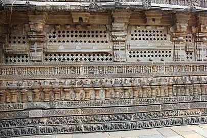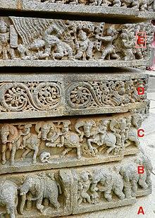 The outer wall of the main temple consists of parallel horizontal bands of artwork carved above the circumambulatory platform.[23] It has three major section, the basement band, the wall band and the top band. The lowest band in the basement section is about 6 inches tall and shows a row of elephants mostly marching to the left in the clockwise direction the devotee is expected to walk. The elephants are not exact copy of each other, rather show different natural expressions and playfulness of elephants.[23] Some show elephants in war, throwing enemies; while others show them teasing the riders in front. The band above the elephants is of horses with armed riders, depicting a military march. In some spots, camels substitute for horses suggesting that the Hoysala had adopted camels into their army.[23] Some spots also show battle scene with horses. In various places, the artists added humor by placing dwarfs and monkeys supporting the front raised leg of the horses.[23]