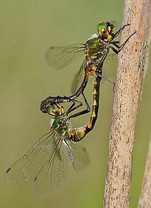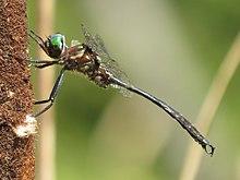 Members of this genus are medium-sized dragonflies with dark bodies and a metallic green lustre. The eyes are brilliant green, and many species have dull to bright yellow markings on the thorax and/or abdomen. The abdomens of males are distinctive, with the first two segments bulbous-shaped, the third constricted, and the rest of the abdomen club-shaped with a straight ending. Females have abdomens with straighter sides.[1] Identifying these dragonflies to species can be difficult.[3] The cerci of males, on the tip of the abdomen, are distinctively shaped in each species, as are the subgenital plates on female abdomens. In some species, the subgenital plate is large and projecting, and is used as a "pseudo-ovipositor" for inserting eggs into a substrate.[1]