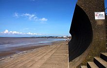 Along the coast, settlements such as Berrow are built on the line of sand dunes separating the low-lying marshes from the Bristol Channel. At the northern end Bleadon lies on the River Axe; and there was for many years a small harbour, sometimes known as Lympsham Wharf.[29] The arrival of the Bristol and Exeter Railway in 1841, which crossed the Axe on a bridge, obstructed river traffic beyond the wharf, making it the limit of navigation for coastal vessels.[29] An Act of 1915 authorised the drainage of the river and installation of a flood gate at Bleadon,[30] although attempts to control the water had occurred on Bleadon Level since medieval times, including an early windmill, in 1613, to pump water into the sea from behind a sea wall.[31] Burnham-on-Sea (population 18,401)[32] is at the mouth of the River Parrett where it enters Bridgwater Bay.[33] The position of the town on the edge of the Somerset Levels has resulted in a history dominated by land reclamation and sea defences since Roman times.[34] Burnham was seriously affected by the Bristol Channel floods of 1607, and various flood defences have been installed since then.[35] A concrete sea wall was built in 1911, and after the Second World War further additions to the defences were made, using the remains of a Mulberry harbour; the present curved concrete wall was completed in 1988.[36] Highbridge, which neighbours Burnham, is near the mouth of the River Brue and the villages of East and West Huntspill.[33]
