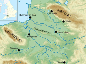 A number of Anglo-Saxon charters document the incorporation of areas of moor in estates, suggesting that the area continued to be exploited.[94] It is easy to see why the area acquired a number of legends, particularly of King Arthur and his followers, who some believe based his court in the hill fort at South Cadbury.[95] According to legend, Alfred the Great burnt cakes when hiding in the marshes of Athelney, after the Danish invasion in 875. After the battle of Edington the Danish king was baptised at Aller and a peace treaty signed at Wedmore.[96]