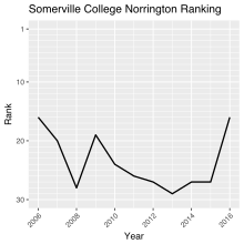 Starting in the 1970s, the traditionally all-male colleges in Oxford began to admit female students.[35] Since it was assumed that recruiting from a wider demographic would guarantee better students, there was pressure on single-sex colleges to change their policy to avoid falling down the rankings.[36] All-female colleges, like Somerville, found it increasingly difficult to attract good applicants and fell to the bottom of the intercollegiate academic rankings during the period.[37]