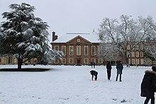 There was no hall large enough to seat the entire college until 1911, when Maitland Hall and Maitland, designed by Edmund Fisher in Queen Anne style and Edwardian Baroque, were opened by H. A. L. Fisher, the Vice-Chancellor of the University and Gilbert Murray.[53] Murray, whose translations of Greek drama were performed at Somerville in 1912 and 1946, supported Somerville in many ways, including endowing its first research fellowship. A fund was raised as a memorial to Miss Maitland, the principal of Somerville Hall (College from 1894) from 1889 to 1906, and this money was used to pay for the oak panelling in Hall. The panelling of the south wall was specially designed to frame the portrait of Mary Somerville by John Jackson.[54] The buildings were constructed on the site of an adjoining building gifted to Somerville by E. J. Forester in 1897 and bought from University and Balliol Colleges for £4,000 and £1,400 respectively.[44] There was difficulty in the construction of the buildings, which is now thought to have been the result of the outer limit of the Oxford city fortifications running under the site. In 1935, Morley Horder reconstructed the archway which connected Maitland Hall and the south wing of Walton House, creating the Reading Room off the main hall and, in 1947, André Gide gave a lecture which filled not only both of these rooms, but the staircase and the quadrangle outside.[53]