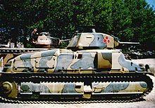 Of these about 288 were in front-line service at the beginning of the Battle of France, with the three armoured divisions of the Cavalry, the Divisions Légères Mécaniques or Mechanised Light Divisions ("light" here meaning "mobile", they were not light in the sense of being lightly equipped[15]). Each of these had an organic strength of eight squadrons with ten S35s; each squadron however had a matériel reserve of two tanks and regimental and brigade commanders in practice had personal tanks too, resulting in a total of 88 vehicles per division. Furthermore, 31 were present in the general matériel reserve, 49 in factory stocks and 26 were being processed for acceptance.[1] These vehicles were later issued to several ad hoc units, such as the 4th DCR (commanded by Charles de Gaulle) which received 39, part of 3e Cuirassiers, the 4th DLM (10), and some Corps-francs Motorisés (about 25). Also the destroyed 1st, 2nd and 3rd DLM were reconstituted with a small number of tanks, the first two divisions received ten S 35s, the third twenty; S 35s further served with the 7e Cuirassiers (25) and a platoon of three was present in the 3e RAM of the 3e DLC.[16] In May 1940 during the Battle of France the DLMs were tasked with the difficult manoeuvre of carrying out a quick advance into the Low Countries, followed by a holding action to allow the infantry divisions following behind to dig themselves in.[17] The 2nd and 3rd DLM were concentrated in the Gembloux gap between Louvain and Namur, where there were no natural obstacles to impede a German advance. They had to spread out somewhat to hold that sector against incursions by the German 3rd and 4th Panzer Divisions. This was necessitated by the local tactical situation and did not reflect some fundamental difference in doctrine between the use of the DLMs and the Panzerdivisionen. Both types of units were very similar in equipment, training and organisation, as the German armoured divisions too were primarily intended for strategic exploitation, while the breakthrough phase was preferably left to the infantry. The resulting tank battle from 13 to 15 May, the Battle of Hannut, was—with about 1700 AFVs participating—the largest until that day and is still one of the largest of all time. The S 35s gave a good account of themselves, proving to be indeed superior to the German tanks in direct combat,[18] but they were rather hesitantly deployed as the French High Command mistakenly supposed the gap was the German Schwerpunkt and tried to preserve their best tanks to block subsequent attacks by the rest of the Panzerwaffe.